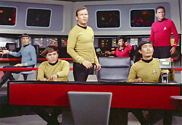Though the world around him was full of racism, bigotry, and xenophobia, not to mention the Cold War fallout shelters, the show that Gene Roddenberry imagined and ultimately created offered a much different view of mankind in the future. Rather than displaying a hatred toward the Russians (who the US were not on friendly terms with in any sense of the word) and the Asians (the US had fought the Japanese in WWII, against the North Koreans, backed by both China and the Soviet Union, in the early 1950s, and at the time in 1964, the Chinese government was currently backing the North Vietnamese), the bridge crew of the starship Enterprise included likable Russian and Asian crew members, Ensign Pavel Chekov and Lieutenant Hikaru Sulu. Rather than portraying an African-American woman as a second-class citizen (as they typically were in the society of the day), on the starship Enterprise she was the intelligent, sexy polyglot and communications officer, Nyota Uhura. Though there was no hatred toward the Scottish people at the time (that I know of), we even had a likable chief engineer, Montgomery Scott, with a Scottish accent. To top it all off, the First Officer of the ship was a pointy-eared, green-blooded alien from the planet Vulcan, Mr. Spock. Gene Roddenberry wanted the show to reflect a crew with cooperative racial diversity at its finest. Remember, this was all presented as a conceptual television show in early 1964… a few months before the Civil Rights Act was enacted, making it legal for a black man to drink water from a previously “whites only” drinking fountain.